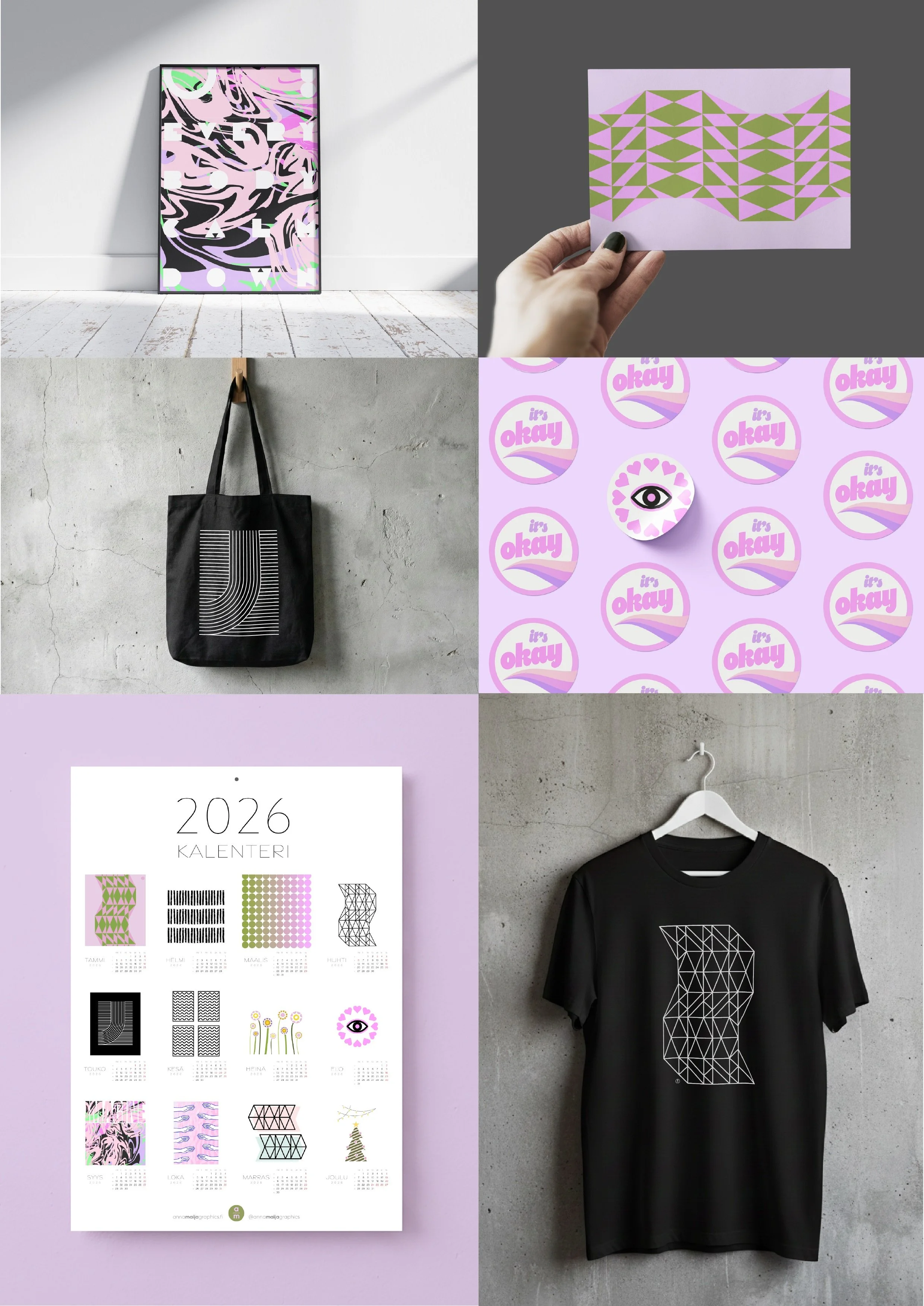 I like to experiment with different geometric shapes and patterns. Some examples of patterns and prints I have designed, printed out and applied to different products (2025) on the Designs page.